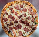 Fresh, vegan & never-frozen dough.Our secret recipe pizza sauce topped with pepperoni, Italian sausage, ground beef, Italian salami, ham, bacon and topped with an extra amount of our special blend of 100% fresh natural cheeses.